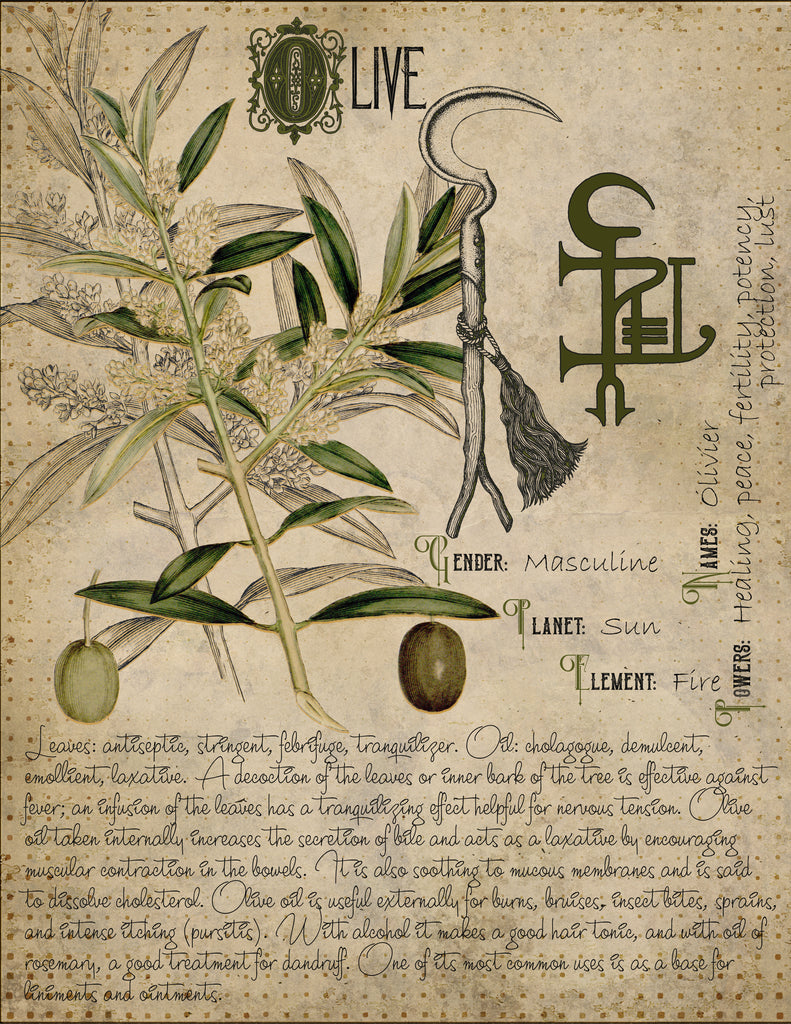 Baths: Combine Olive Leaf with sea salt, dried lavender buds, and a few sprigs of sage for a restorative soak that cleanses the aura, soothes the spirit, and renews inner strength.